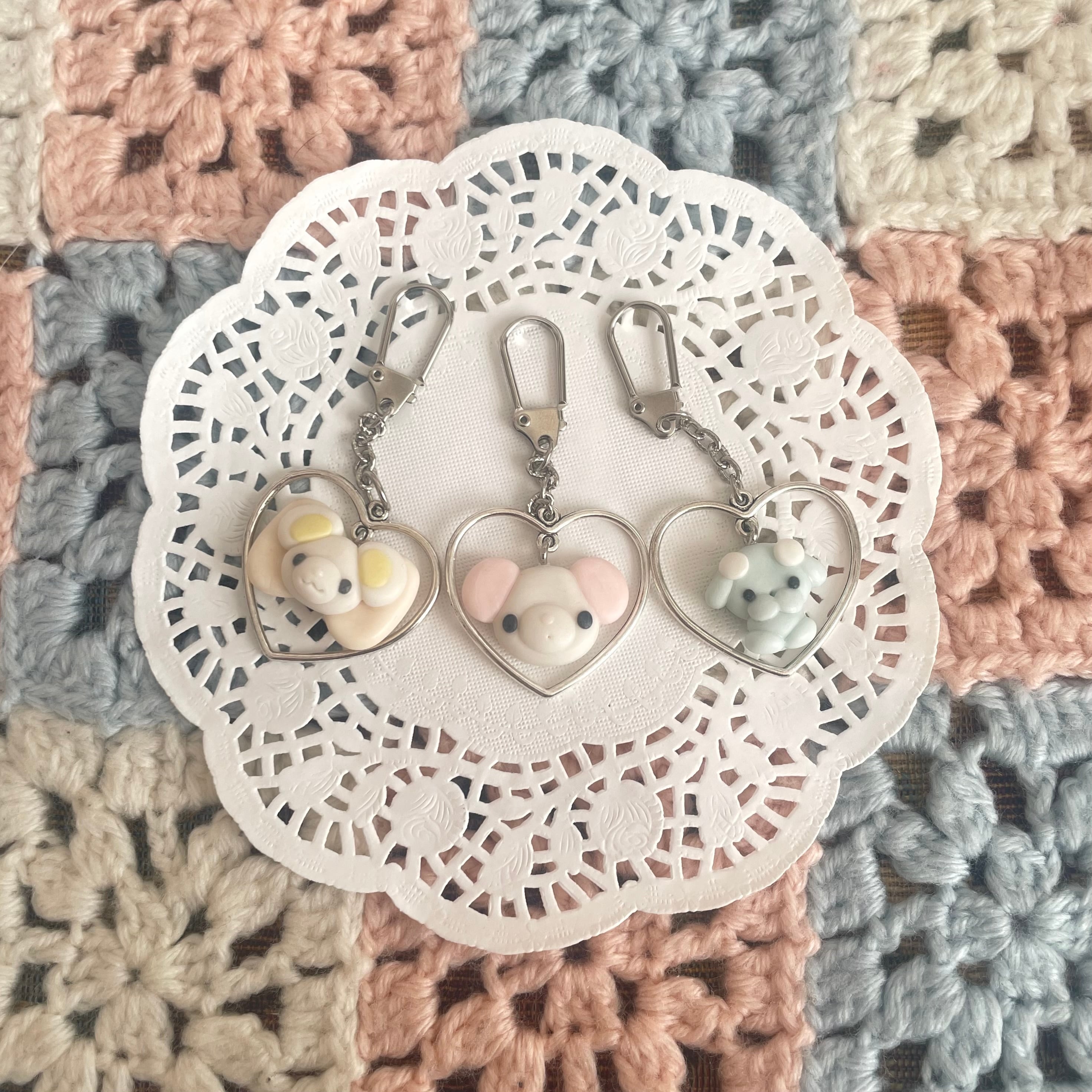 ハートの中に樹脂粘土でできた動物パーツが入っているデザインになっています。少しマットな仕上がりです♡